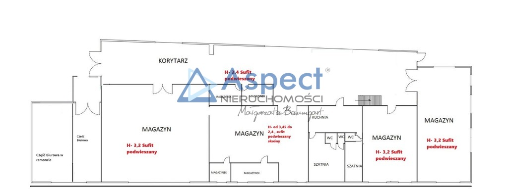 Budynek podzielony jest na część biurową ok 100 m2 oraz magazynową (rzuty w galerii).