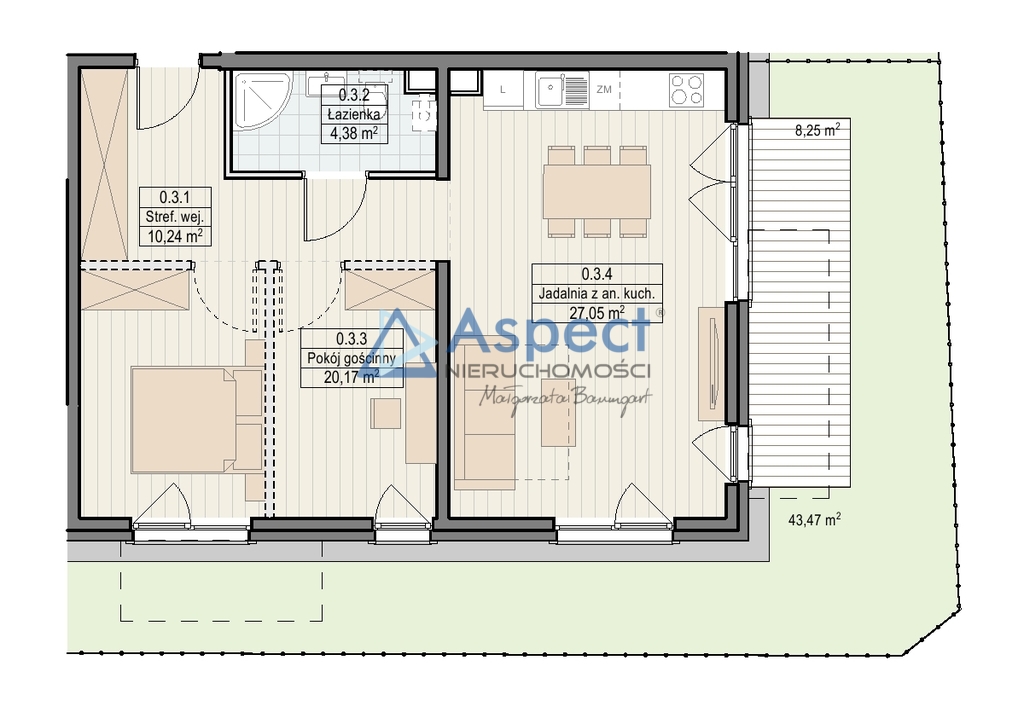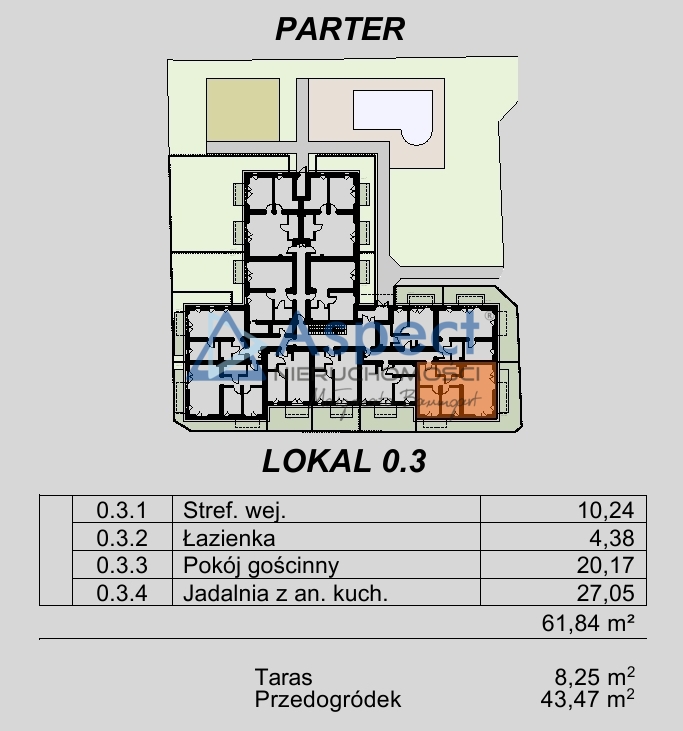 Apartament będący przedmiotem tej oferty znajduje się na parterze i ma powierzchnię 61.98 m2. Składa się z salonu z aneksem kuchennym, 2 sypialni, łazienki i przedpokoju.